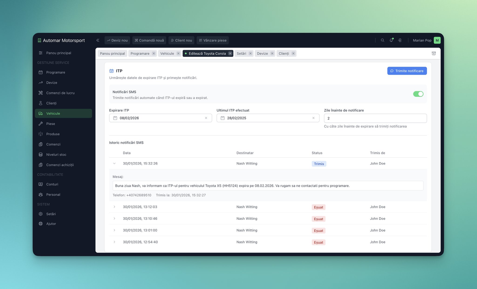 Gestionare ITP: mai mult decât un tabel cu date. Modulul monitorizează datele de expirare pentru fiecare vehicul din sistem și trimite alerte SMS automate înainte de expirare. Proprietarul service-ului configurează cu câte zile înainte să notifice, iar sistemul se ocupă de rest. Fiecare SMS e logat cu status de livrare, destinatar și timestamp. Istoric complet notificări per vehicul, ca să știi mereu cine a fost notificat și când.